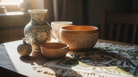 A still life composition featuring several pieces of decorative ceramic pottery arranged on a wooden table. A tall, ornate vase with a floral pattern stands to the left, accompanied by a small, intricately carved round pot. To the right, a wide, shallow bowl with geometric carvings sits next to a smaller, similarly decorated bowl. Sunlight streams in from the left, casting shadows and highlighting the textures of the pottery and a woven cloth beneath.