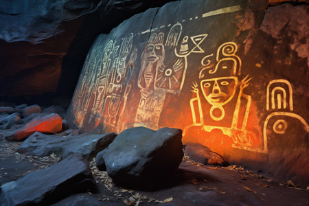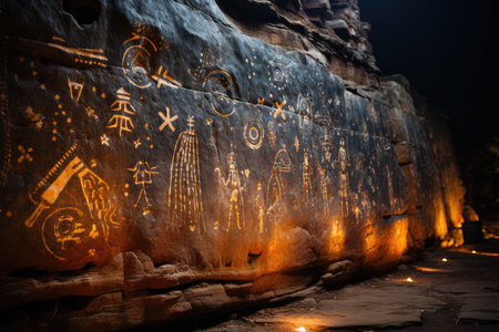 brightly illuminated petroglyphs on a rock surface, created with generative ai