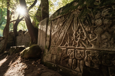 close-up of intricate carvings on ancient stone, with sunlight filtering through the trees, created with generative ai