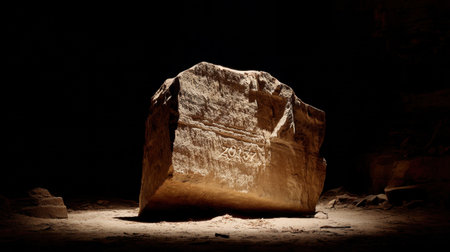 A large stone with unfamiliar markings sits in a dark cave, creating a sense of mystery and intrigue, best suited for exploration-themed projects.