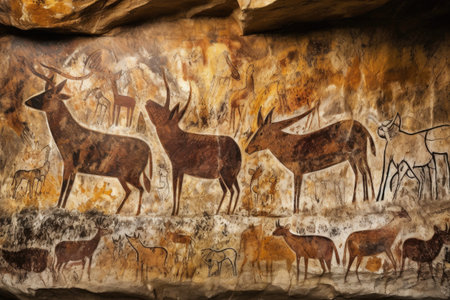 close-up of intricate cave art depicting animals, created with generative ai