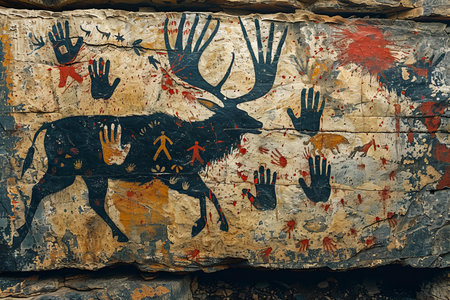 Mural painting on the wall of a cave with deer silhouettes