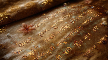 Close-up of old South Asian scripts on parchment, intricate traditional decor surrounding, blank copy space