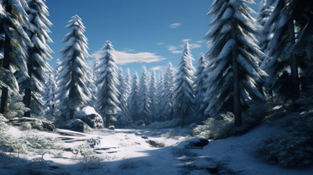 A snowy forest landscape with trees covered in frost and a peaceful atmosphere.