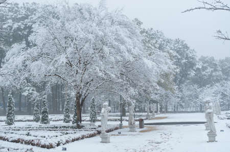 winter park. Triangular Christmas trees. Snow Forest Peterhof
