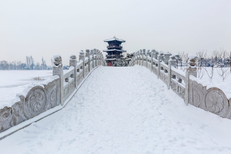 Winter Snow Scenery in Cherry Blossom Garden in East Lake Scenic Area, Wuhan, Hubei