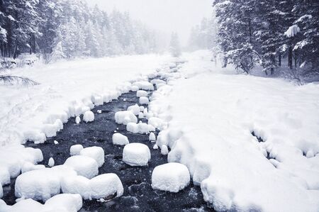 Stream in the winter forest covered with snow. Beautiful winter landscape.