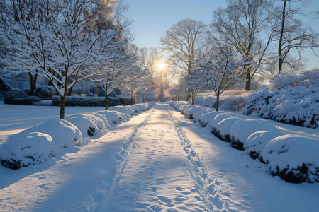 A sunlit snowy path winds through a winter landscape, serene and peaceful.