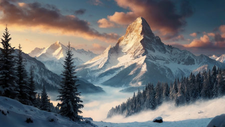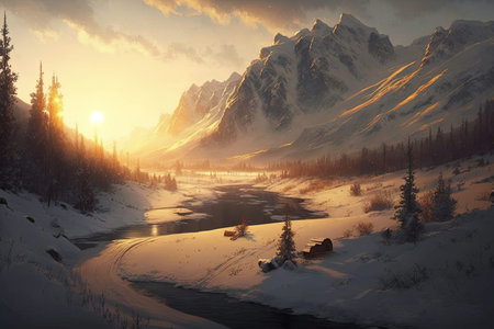 A breathtaking winter sunrise paints the snow-covered landscape with golden light. Frozen trees stand tall, reflecting serenity.