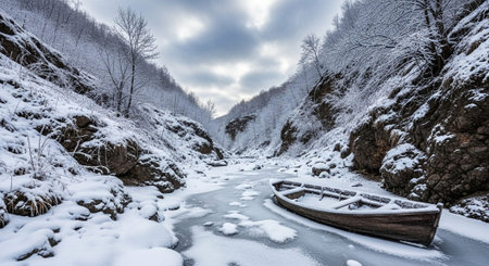 Mountain river with winter white snowy landscape. Winter, cold or Christmas landscape. Beautiful stream with flowing water, panoramic view.