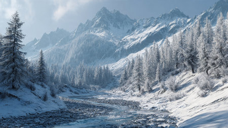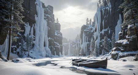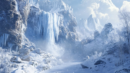 Fantasy winter landscape with frozen waterfall and snow-capped mountains