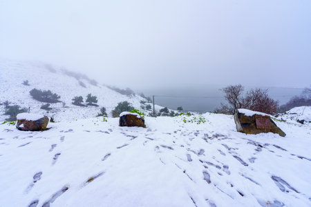 Merom Golan, Israel - March 24, 2022: View of the Einav Observation Point. And the Bental Reservoir in the Golan Heights, on a snowy and foggy day. Northern Israel