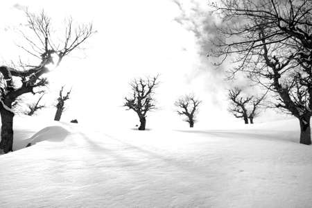 Beautiful winter landscape with snow covered trees and foggy sky.