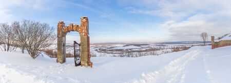 Panorama of the Oka River and the gate of an old manor in the Nizhny Novgorod region in winter