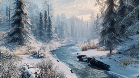Beautiful winter landscape in the forest with a river and snow covered trees