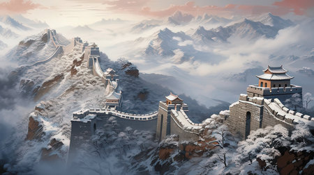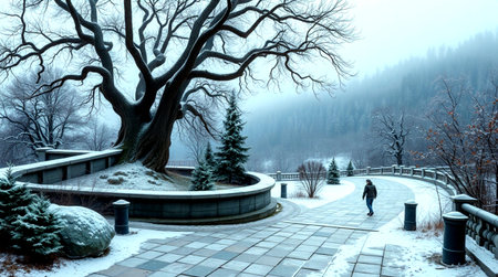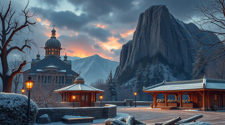 Serene Monastery Courtyard Blanketed in Snow, Embracing Winter's Tranquility.