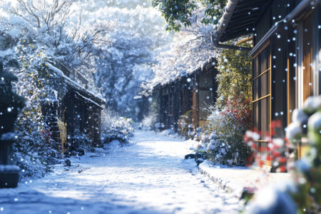 A tranquil snowy path winds between traditional wooden houses in a winter village, surrounded by trees.