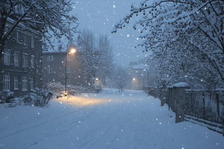Gentle snow falls on a tranquil street, illuminating the scene with warm lights during a chilly winter night.