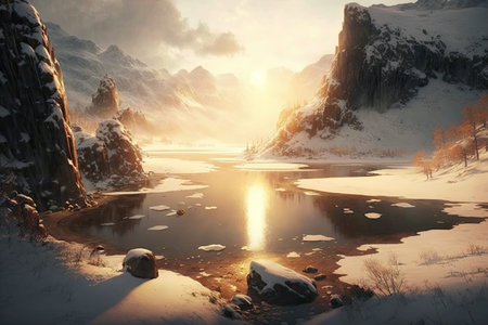 Fantasy landscape with snowy mountains and frozen lake. 3d rendering