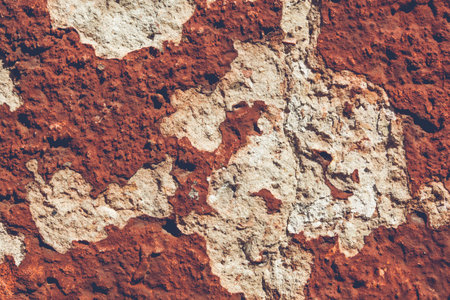 Close-up of old stucco cracks on the building wall. Weathered paint cracks on plaster.