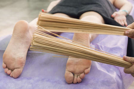 Massage with bamboo sticks of feet. A relaxing and invigorating Brazilian Creole massage. Lymphatic drainage massage with thin bamboo brooms.