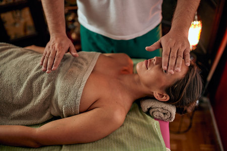 Young woman laying on her back enjoying reiki treatment from a male physiotherapist in a health spa. Wellness, alternative medicine, lifestyle concept.