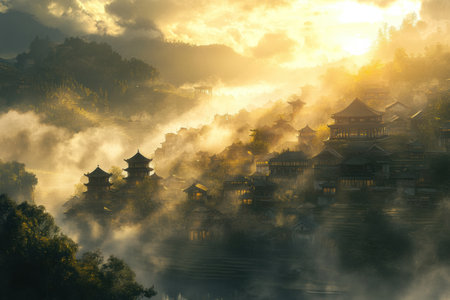 Golden sunlight breaks through mist, illuminating quaint Asian structures nestled among lush hills, creating a serene morning atmosphere.