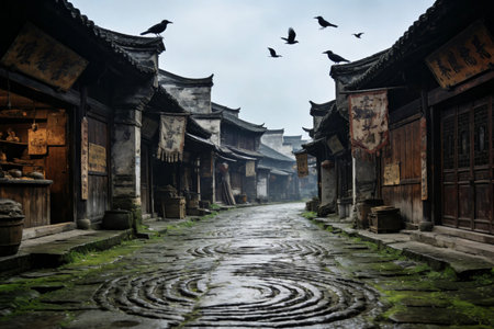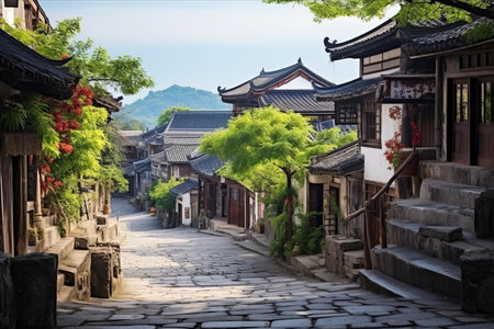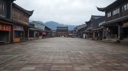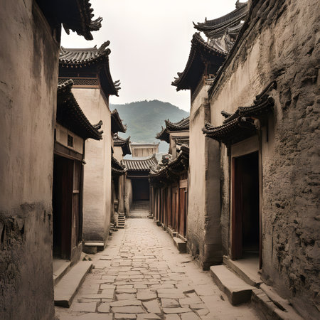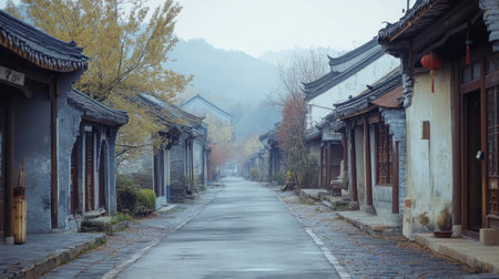 A quiet Chinese village with stone houses and cobblestone streets. No people, copy space.