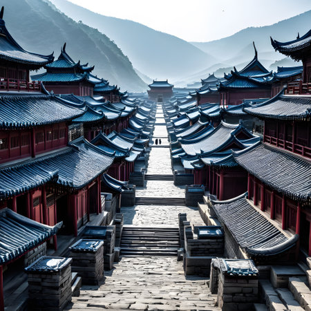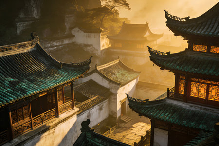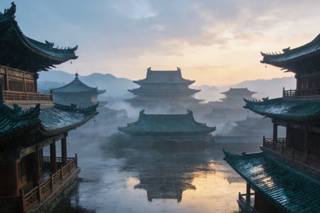 Captivating view of traditional Asian rooftops at dawn, enveloped in gentle fog. The quiet atmosphere invites exploration and appreciation of cultural heritage.