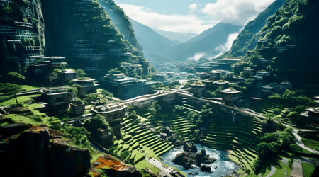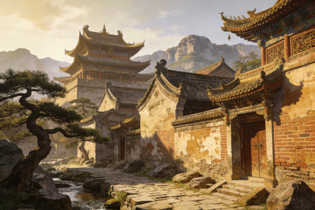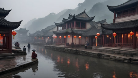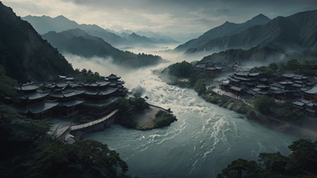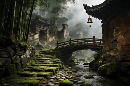 a village nestled beneath a misty mountain, showcasing the serene influence of zen buddhism. this photo captures the essence of dark and gritty cityscapes, with a touch of backlit photography. the bold chromaticity adds depth to the atmospheric portraits and shots, highlighting the beauty of buddhist art and architecture. ai generated