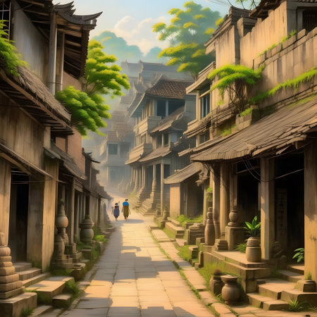 A serene pathway meanders through a traditional village, surrounded by lush greenery and warm sunlight. Perfect for showcasing tranquility and culture.