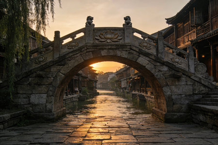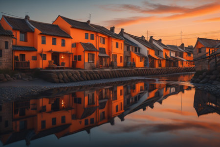 A tranquil sunset illuminates a historic cobblestone alley, showcasing charming wooden architecture. Perfect for conveying serenity and nostalgia.