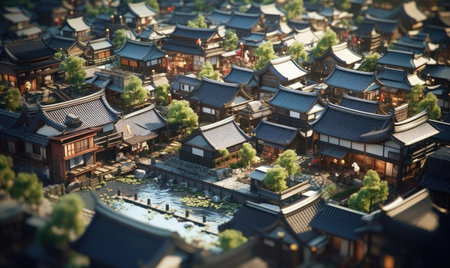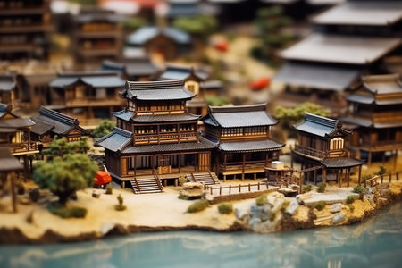 A miniature model of a japanese village by a river. Generative AI.