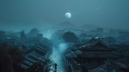 This evocative image captures a lone figure walking through the lantern-lit streets of a traditional Chinese village under the gentle glow of a full moon. The surrounding rooftops are steeped in the cool tones of the night, with the moon's soft light casting a tranquil ambiance over the scene. A sprinkle of stars in the vast sky adds a touch of wonder, enhancing the mood of peaceful isolation in a timeless setting. This scene is perfect for themes of contemplation, the beauty of solitude, and the fusion of culture with natural beauty.