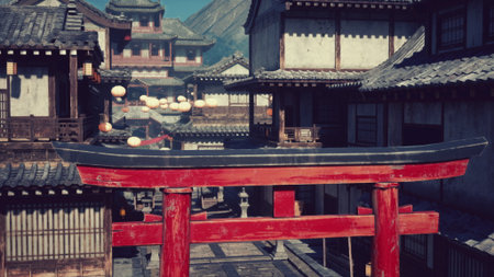 In a tranquil village setting, a vibrant red gate frames a path lined with traditional buildings. Lanterns hang softly, adding charm as sunlight bathes the streets in warmth, inviting exploration.
