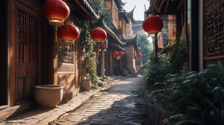 A serene historic street lined with red lanterns in a traditional village. The beautifully crafted wooden architecture offers a charming atmosphere perfect for exploration and photography.