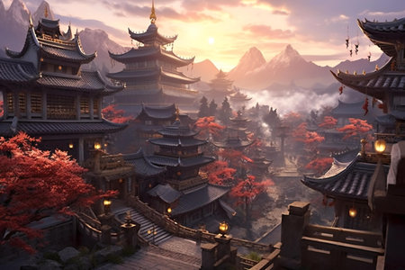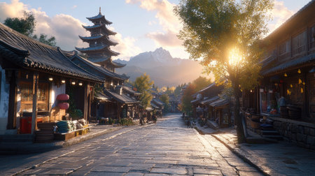 A picturesque view of a traditional street during sunset in an Asian village, showcasing beautiful architecture, mountains, and a serene atmosphere perfect for relaxation.