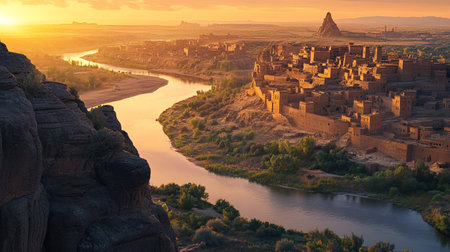 A dazzling cityscape illuminated by a warm, dusty orange glow. The sky is filled with swirling dust particles, giving the scene an otherworldly atmosphere. This image inspires awe and contemplation.