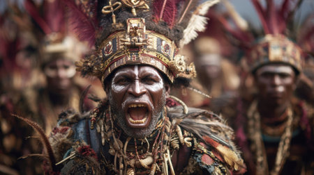 A powerful shot of a tribal chief, adorned in elaborate regalia, leading a group of dancers in a primal and energetic celebratory ritual