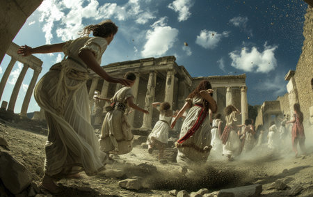 Pompeii tragedy: a haunting portrayal of the volcanic eruption's chaos, horror, and the people's plight, capturing the devastation and human tragedy in the ancient city's ruins.