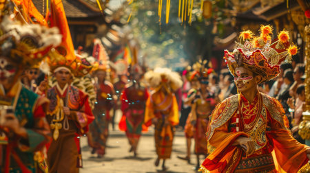 Colorful parade celebrates traditional clothing and spirituality in rural Asia generated by artificial intelligence