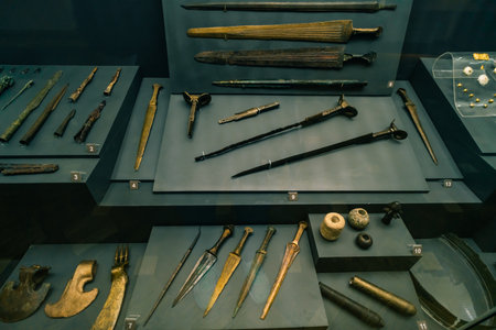 Brussels, Belgium - August 17, 2019: Variety of swords on exhibit in The Royal Museum of the Armed Forces and Military History, famous military museum in Brussels.