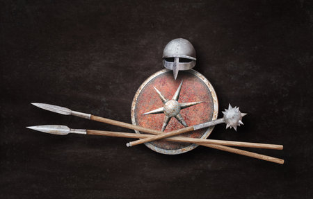 Close-up of a medieval old steel helmet and sword on a wooden shield. Antique viking weaponry outdoors.