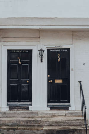 Rye, UK - October 10, 2020: Entrance of The House with Two Front Doors, a fifteenth century Bed and Breakfast on Mermaid Street in Rye, one of the best-preserved medieval towns in England.
