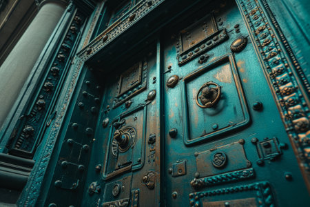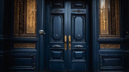 This image features dark blue double doors with intricately golden embellishments and glass panels, softly illuminated from both sides, creating a sense of elegance and mystery. AI generated image
