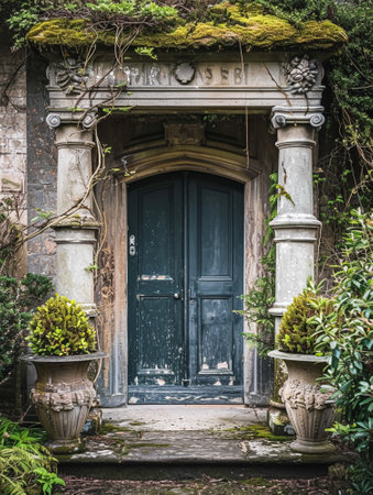 Entrance to a historic manor, framed by antique architectural elements and flanked by potted topiaries, features an aged door, the surrounding ivy and stonework add to the timeless elegance of the property