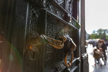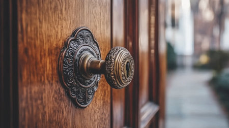 Close-up view of an antique door handle with intricate design, showcasing fine craftsmanship and classic elegance. Perfect for architectural themes.