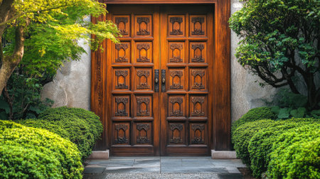 This image showcases a stunning wooden door intricately designed, surrounded by vibrant greenery in a serene garden setting. Perfect for architectural inspiration.