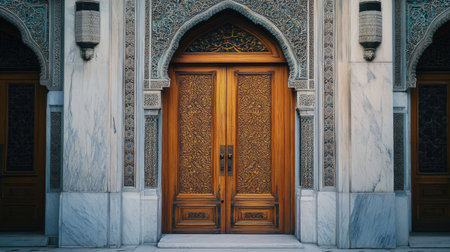 This image features a pair of intricately carved wooden doors set within a stunning marble archway, highlighting rich architectural detail and cultural heritage.
