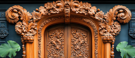 Explore a beautifully crafted wooden doorway adorned with intricate carvings, showcasing the elegance of historic architecture and cultural artistry.
